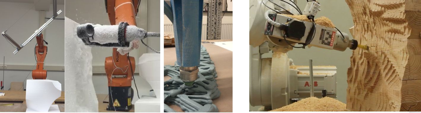RB lab has developed expertise in robotic 3D printing with clay, silicon, and recyclable plastic; hot wire cutting and milling of EPS and wood; stacking linear elements. Depending on the methods and materials used, partners from academia and R&D such as ESA, PoliMi, UniFr, TU Eindhoven, HvA and industry such as Vertico, 3D Robot Printing, ABB, KUKA, etc. are involved. Results are exhibited at renowned venues such as Centre Pompidou and Dutch Design Week and are published on platforms such as Springer book series Adaptive Environments and Spool Cyber-physical Architecture. In addition, the RB lab has expertise in integrating sensor-actuators in the built environment. Both are using some level of Artificial Intelligence (i.e. Machine Learning) in the processes of production and operation.
