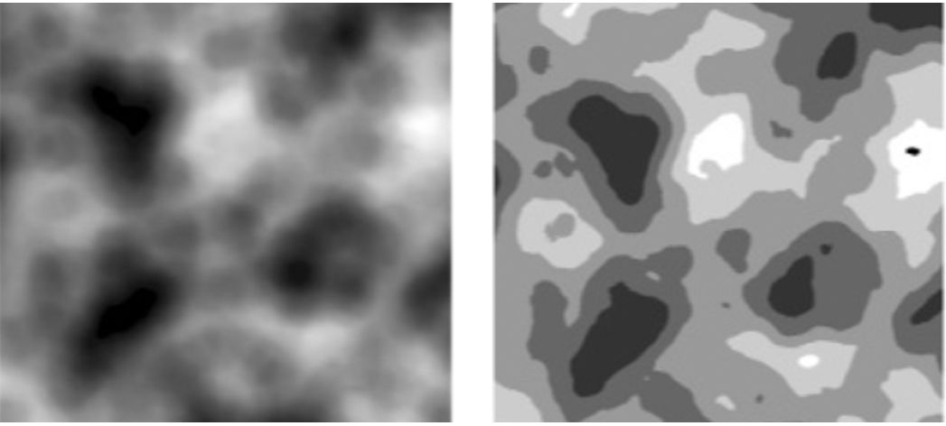 Depth Maps: Original input (left) and simplified depth map (right). The image underwent a thresholding operation, classifying pixels into five distinct intensity levels. This segmentation technique provides nuanced distinctions in visual features by categorizing the image into five layers based on intensity values. The choice of five layers strikes a balance between computational efficiency and the need to capture both coarse- and finer-grained structures in the lava tube. While optimizing computational resources, future adaptations may consider adding layers to enhance representation, acknowledging the trade-off between simplicity and the depth required for a more detailed analysis (Calabrese et al. 2024).