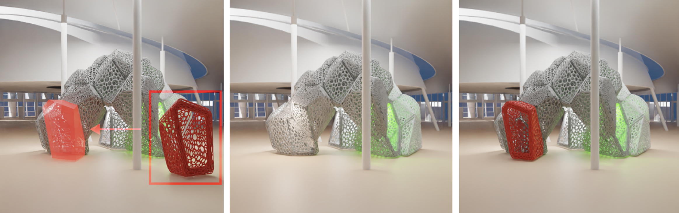 Reconfiguration may be implemented using object and placement recognition, which is a well-known computer vision task with available model architectures. The objects i.e. building components are labeled with id numbers that are the ‘keys’ to the correct placement within the larger building components constellation. The project addresses the question of how robotics are integrated in user-driven building processes and the environment in order to make production efficient and utilisation smart. The distributed sensor-actuators are conceived as intelligent networked components, locally driven by people’s preferences and environmental conditions.