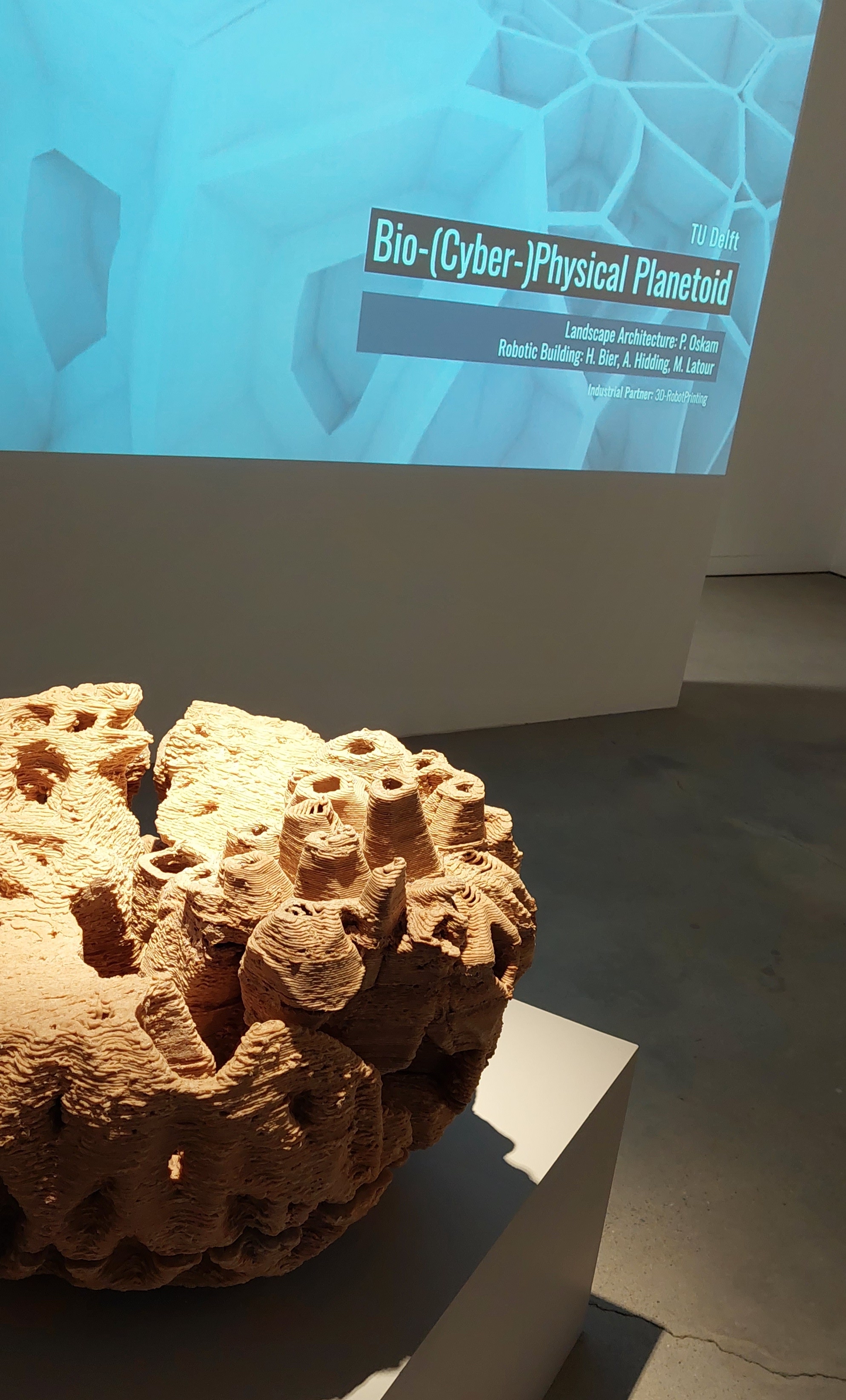 Furthermore, ‘artists’ talk’ presenting the conceptual development of research implemented in the Robotic Building Lab. This involves exploring process and results of that process through amongst others the ‘Bio-cyber-physical Planetoid’ as featured in the exhibition 'SHErobots', which “brings together iconic and emerging examples of robotic ‘tool, toy, companion’. As a tool, robots have a rich history in architectural fabrication, including material explorations and new construction techniques; Henriette Bier (NL) creates robotically fabricated, bio-cyber-physical pods that support sustainability of more-than-human species. Toy foregrounds feminist critiques of gender and cultural stereotypes through conceptual re-imaginings of robots; artist Elena Knox’s (JN) ‘Gynoid Survival Kit’ poses troubling issues of power, agency and personal safety embedded in the making of gynoid robots. While companions is exemplified by media artist Mari Velonaki’s (AU) pioneering social robotics artwork ‘Fish-Bird’, which portrays two robotic agents engaged in a poetic dialogue with the audience they encounter, created and first shown at The University of Sydney 20 years ago.”