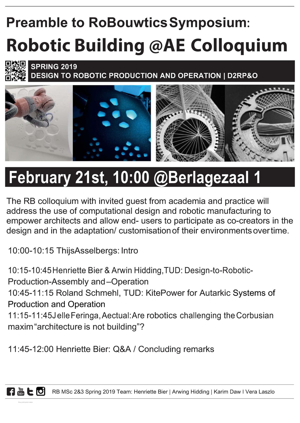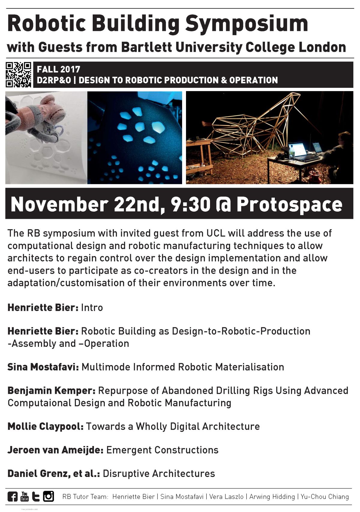 The one-day symposium is an opportunity to make an inventory of current tendencies in autonomous construction and human-robotic interaction in architecture. It aims at affirming and/or challenging research agendas in the domain of architectural robots. The leading questions for the symposium are: